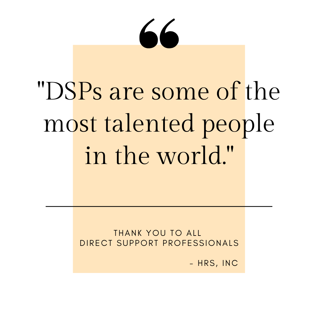 I think you could argue that DSPs are some of the most talented people in the world. (And I say that not just because I used to be one!) What other career requires you to wear as many hats? At any given moment on a shift you may be asked to be a teacher, coach, cook, personal assistant, advocate, stylist, chauffeur, nurse, therapist, tech support specialist, job coach, physical trainer, friend.