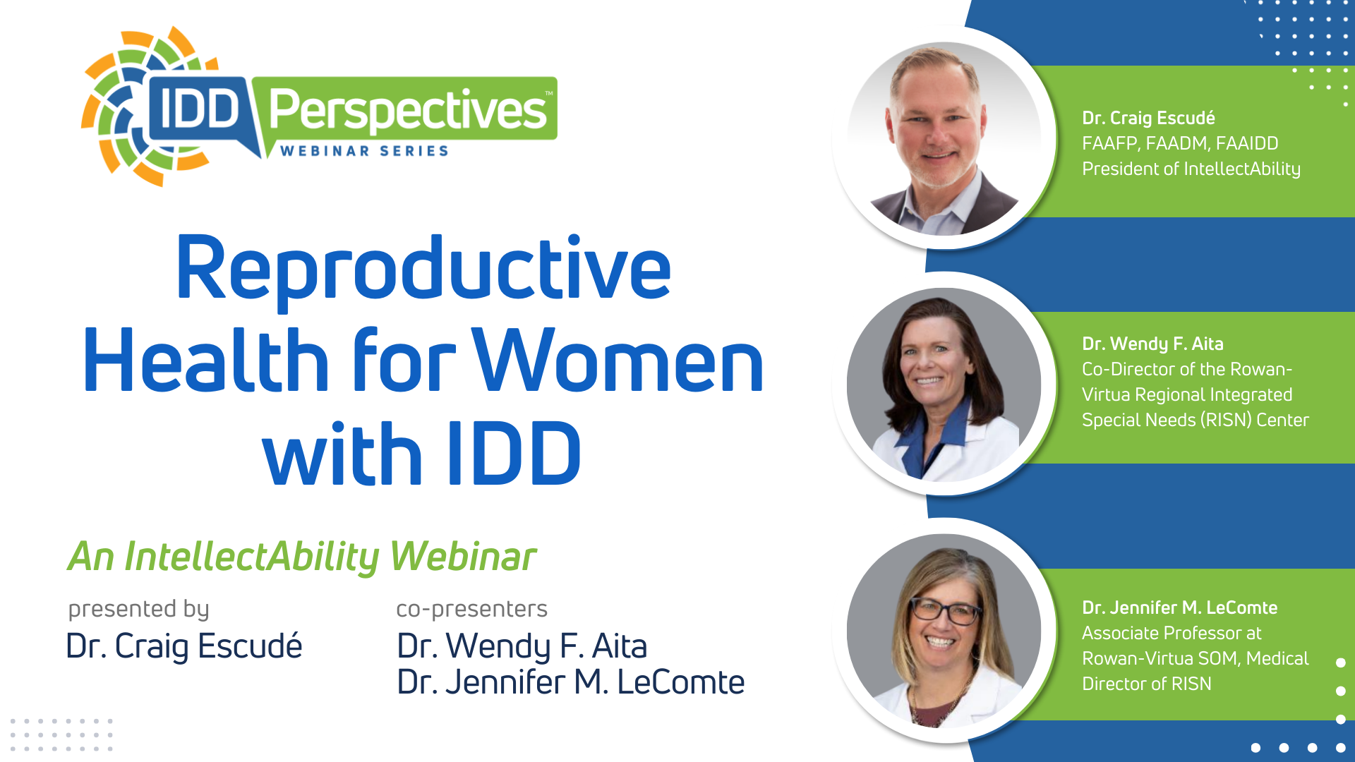 Hosted by Dr. Craig Escudé, FAAFP, FAADM, FAAIDD, President of IntellectAbility, the session featured Dr. Jennifer LeComte and Dr. Wendy Aita, leaders in inclusive healthcare and trauma-informed practice. Together, they explored how providers, supporters, and systems can improve access to reproductive health services for people with IDD, who often face significant barriers and systemic challenges in accessing both reproductive and mental health care.