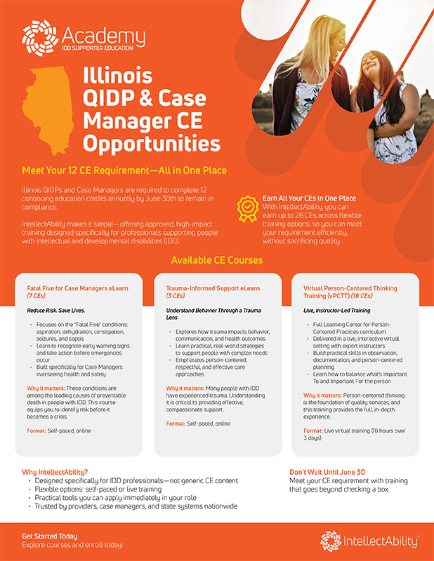 Illinois QIDPs and Case Managers must complete 12 CEs annually to remain in compliance.