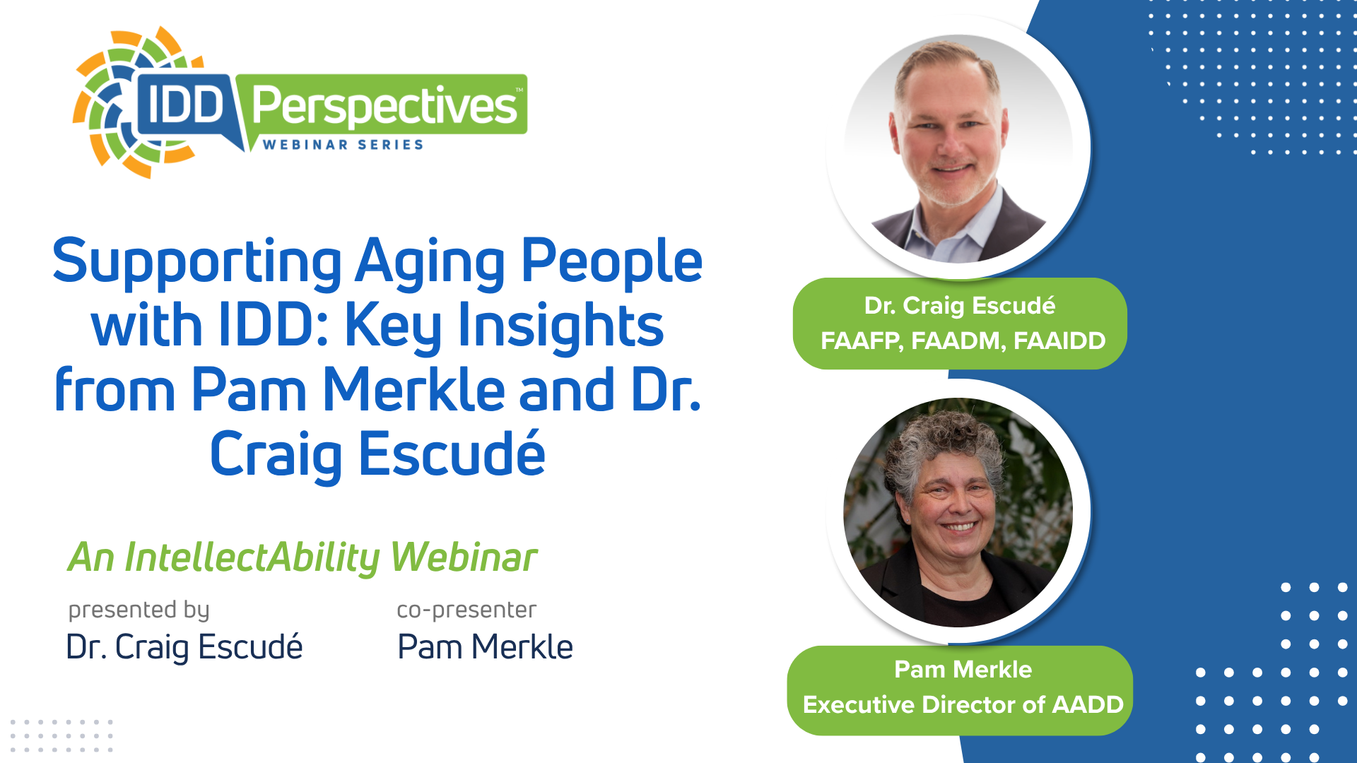In a recent IDD Perspectives webinar, Pam Merkle, Executive Director of the Association on Aging with Developmental Disabilities, joined Dr. Craig Escudé, President of IntellectAbility, to discuss the unique issues people with IDD face as they age and practical strategies to help them thrive.